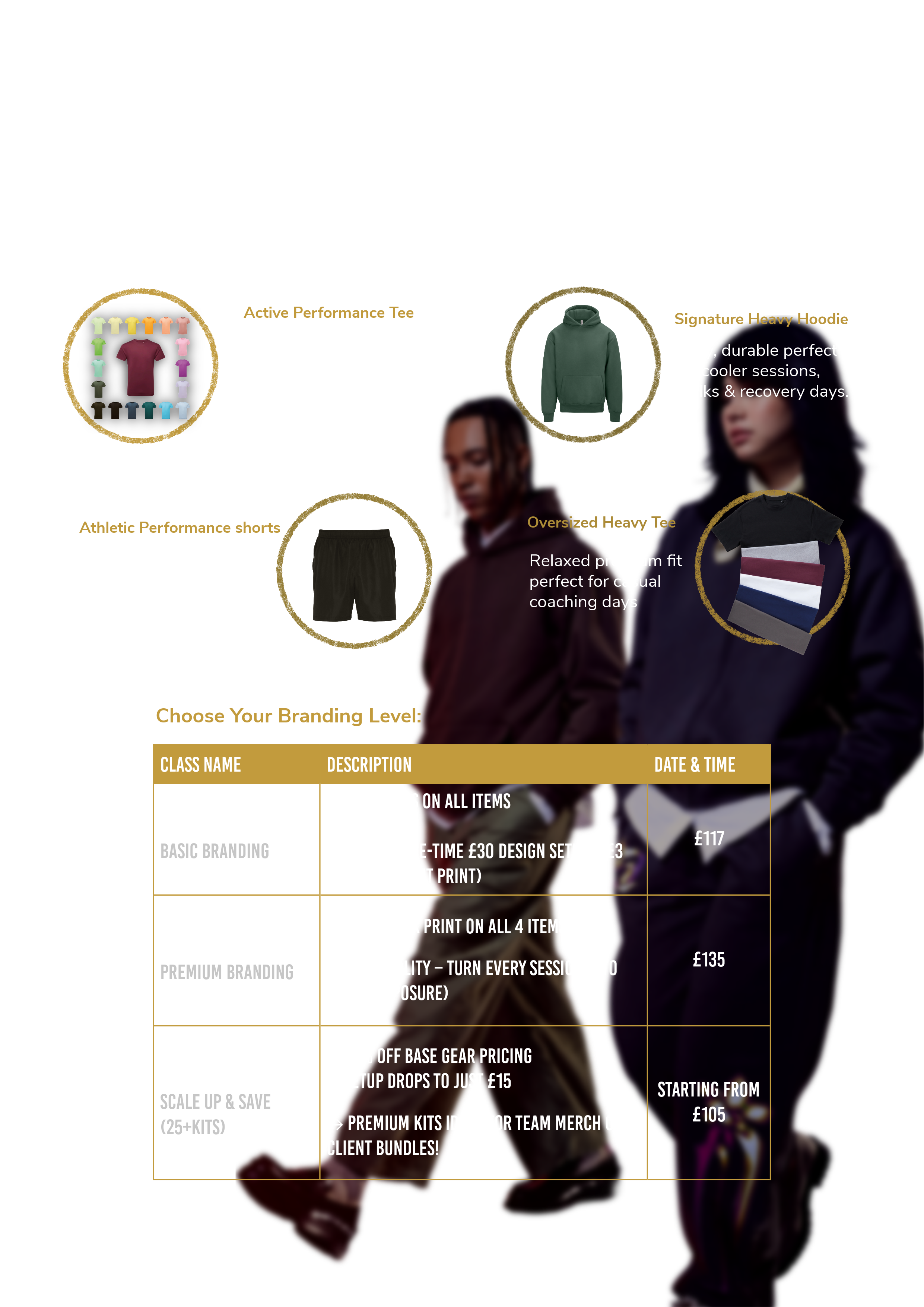 This pack includes : Active Tee (TR010), Oversized Tee (AM015), Heavyweight Hoodie (JH120), plus shorts. Front + Back print on all 4 items (Max visibility – turn every session into brand exposure)